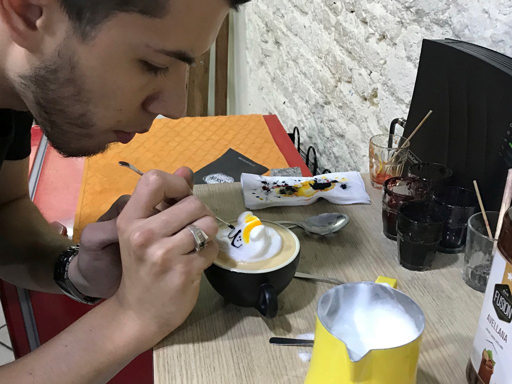Alejandro nos contó que parta hacer esta técnica, se necesita paciencia, perseverancia y rapidez, obviamente para que el café salga con la temperatura adecuada. Primero nos hizo elegir una salsa que va como base en cada preparación, luego desde la máquina va saliendo el café, coloca la leche con mas espuma de lo normal y rápidamente empieza a diseñar sobre la misma.
