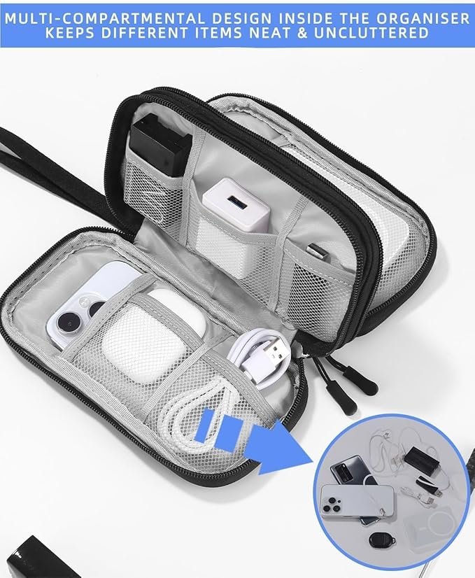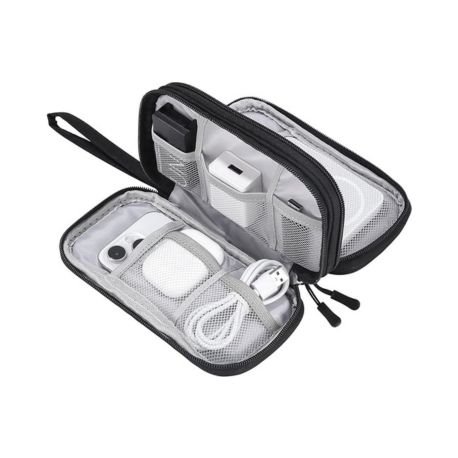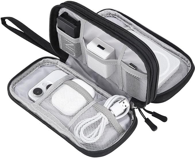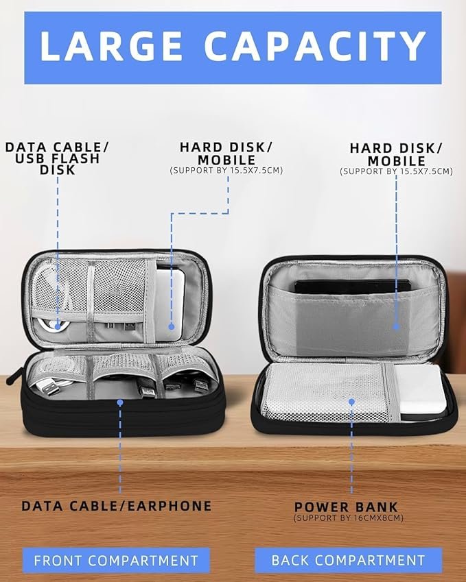 - Gran Capacidad: La bolsa de almacenamiento de electrónica tiene un doble compartimento interior con espacio suficiente para cables, memorias USB, teléfonos móviles, cargadores, ratones, auriculares, unidades flash y otros accesorios.